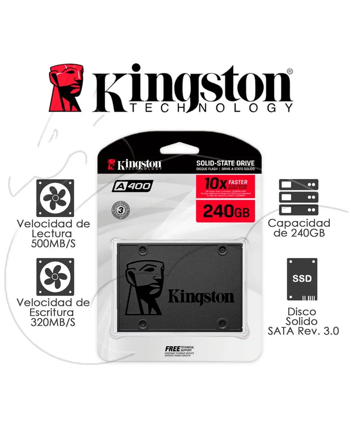 El disco duro SSD 240 GB Kingston de estado sólido A400 es diez veces más rápida que un disco duro estándar, con tiempos de arranque, carga y transferencia lisos con velocidades de lectura optimizadas con velocidades de lectura y escritura de hasta 500 MB/s y 450 MB/s. Sin los problemas de un disco duro mecánico, la duradera resistencia a impactos y vibraciones del A400 hace que sea perfecto para portátiles y otros ordenadores móviles.